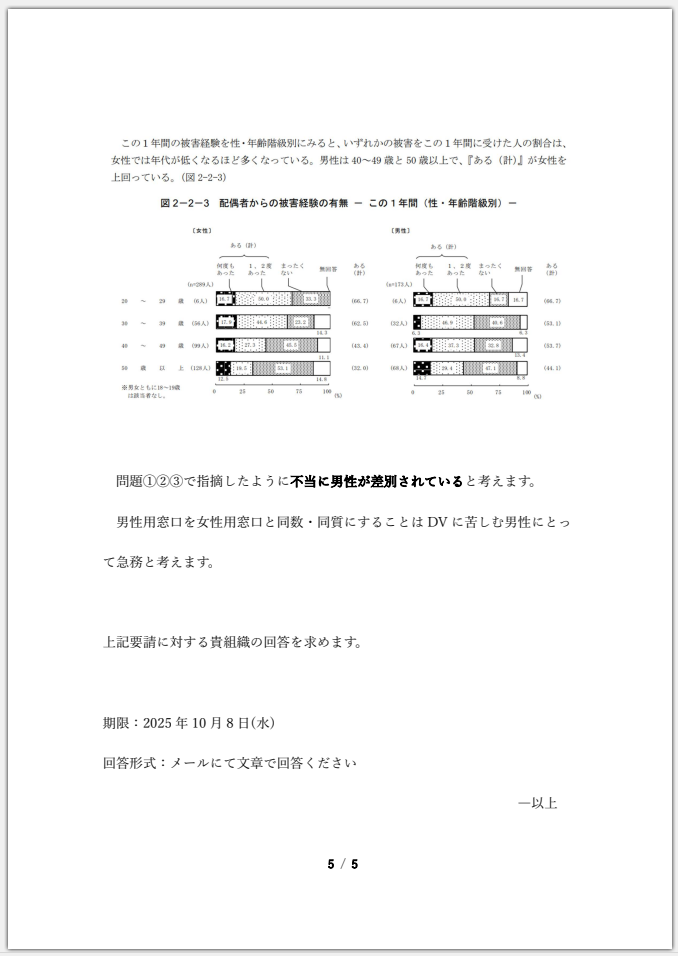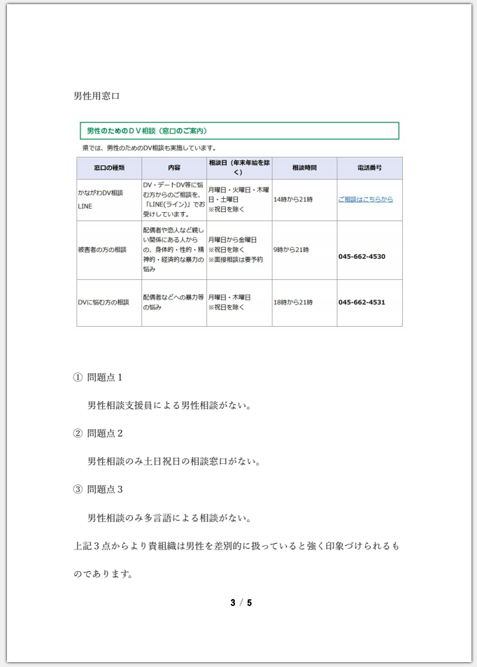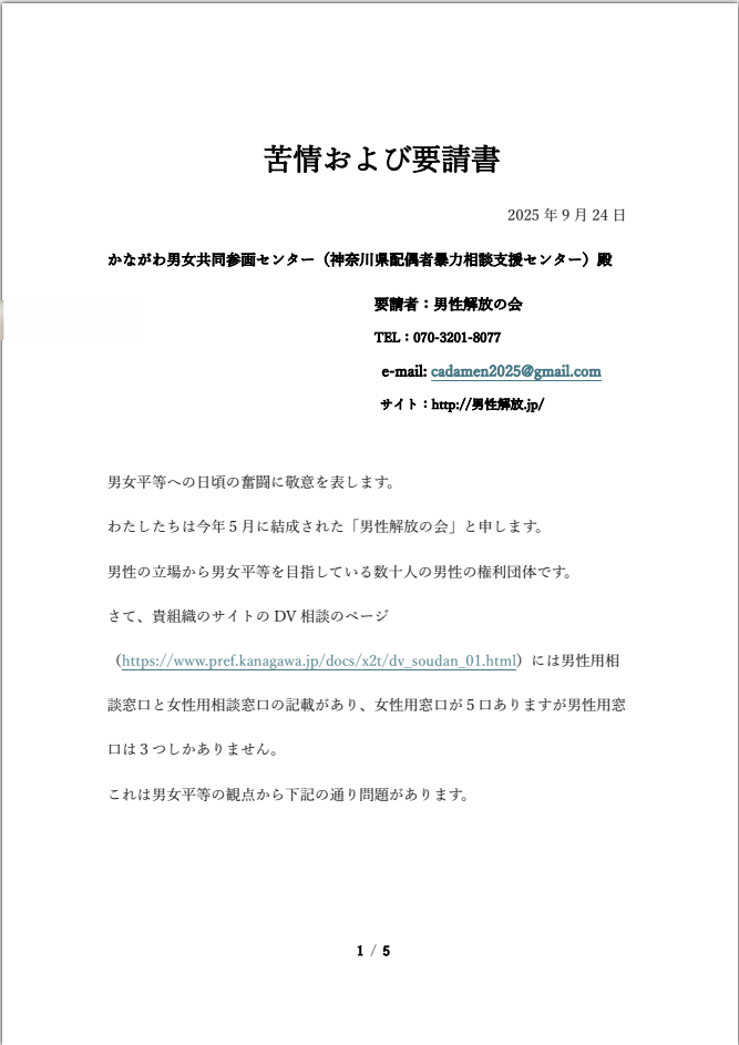 9月24日、かながわ男女共同参画センター(かなテラス)に男性DV相談を男女平等にするように苦情・要請をおこないました!(回答期限:10/8)