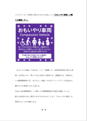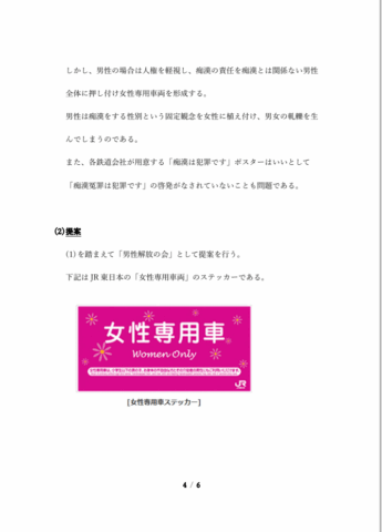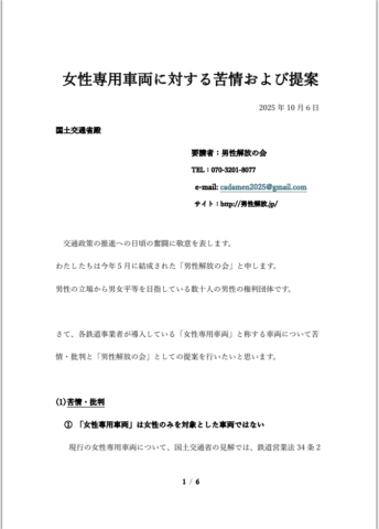 2025年10月6日 / 最終更新日時 : 2025年10月6日 takundo What'sNew 2025年10月6日(月)、国土交通省に「女性専用車両に対する苦情および提案」をFAXしました。 「女性専用車両」を「おもいやり車両」に変更するよう国交省に提案しました。 FacebookXBlueskyHatenaCopy コメントを残す コメントをキャンセルメールアドレスが公開されることはありません。 ※ が付いている欄は必須項目ですコメント ※ 名前 ※ メール ※ サイト 次回のコメントで使用するためブラウザーに自分の名前、メールアドレス、サイトを保存する。