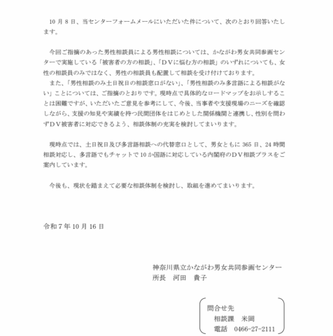 男性相談員がいるのはかりますが我々が要望しているのは女性相談員に相談されたくない男性もいるということです。