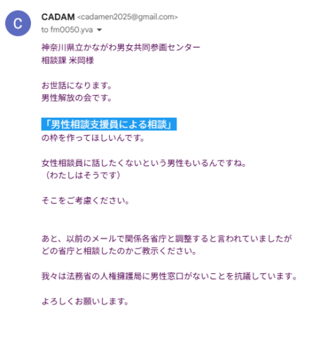 かなテラスが男性相談員が対応する男性専用窓口の必要性を理解してくれない。